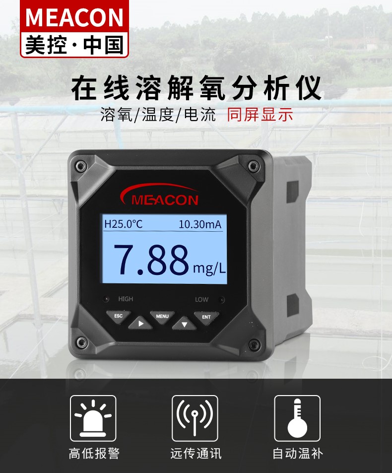 (Dissolved Oxygen)是指溶解于水中分子状态的氧,即水中的O2,用DO表示。溶解氧是水生生物生存不可缺少的条件。溶解氧的一个来源是水中溶解氧未饱和时,大气中的氧气向水体渗入;另一个来源是水中植物通过光合作用释放出的氧。溶解氧随着温度、气压、盐分的变化而变化,一般说来,温度越高,溶解的盐分越大,水中的溶解氧越低;气压越高,水中的溶解氧越高。溶解氧除了被通常水中硫化物、亚硝酸根、亚铁离子等还原性物质所消耗外,也被水中微生物的呼吸作用以及水中有机物质被好氧微生物的氧化分解所消耗。所以说溶解氧是水体的资本,是水体自净能力的表示。天然水中溶解氧近于饱和值(9ppm),藻类繁殖旺盛时,溶解氧含量下降。水体受有机物及还原性物质污染可使溶解氧降低,对于水产养殖业来说,水体溶解氧对水中生物如鱼类的生存有着至关重要的影响,当溶解氧低于4mg/L时,就会引起鱼类窒息死亡,对于人类来说,健康的饮用水中溶解氧含量不得小于6mg/L。当溶解氧(DO)消耗速率大于氧气向水体中溶入的速率时,溶解氧的含量可趋近于0,此时厌氧菌得以繁殖,使水体恶化,所以溶解氧大小能够反映出水体受到的污染,特别是有机物污染的程度,它是水体污染程度的重要指标,也是衡量水质的综合指标。因此,水体溶解氧含量的测量,对于环境监测以及水产养殖业的发展都具有重要意义。